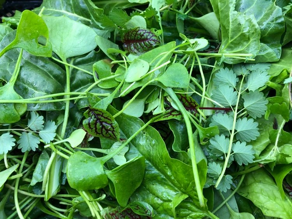 Première récolte des pousses sauvages de Chameyrac : ail des vignes, nombril de Vénus, alliaire, pimprenelle, plantain corne de cerf…avec nos épinards et pourpiers…